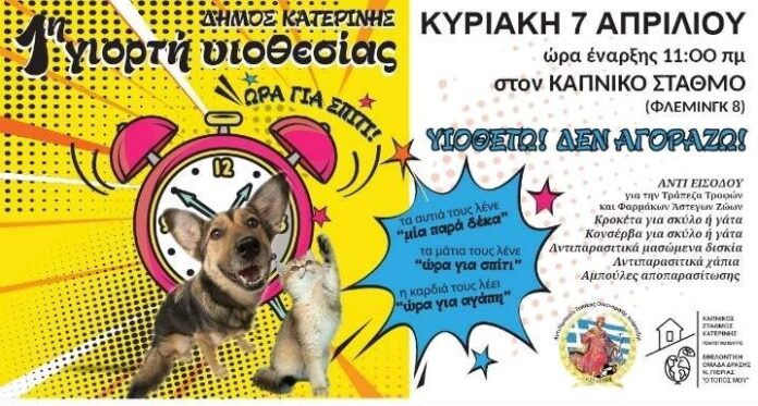 Υπέροχα τετράποδα πλάσματα που αναζητούν την δική τους οικογένεια, νεαρά και ενήλικα σκυλάκια και γατάκια μας περιμένουν, με την προσδοκία ανάμεσά μας να βρεθεί αυτός, που με μια σοβαρή & υπεύθυνη πράξη πολιτισμού & αγάπης θα αλλάξει τη ζωή τους. Ο λόγος για  την 1η γιορτή Υιοθεσίας, που τιτλοφορείται «ΥΙΟΘΕΤΩ! ΔΕΝ ΑΓΟΡΑΖΩ!» και με αφορμή την παγκόσμια ημέρα αδέσποτων ζώων, διοργανώνει ο Δήμος Κατερίνης, την Κυριακή 7 Απριλίου, στις 11:00 π.μ. στον Καπνικό Σταθμό (Φλέμινγκ 8).