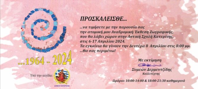 Σας προσκαλούμε να τιμήσετε με την παρουσία σας την ατομική έκθεση του καλλιτέχνη, Συμεών Δερμεντζίδη, που θα λάβει χώρα στην Αστική Σχολή Κατερίνης από τις 6 έως τις 17 Απριλίου.