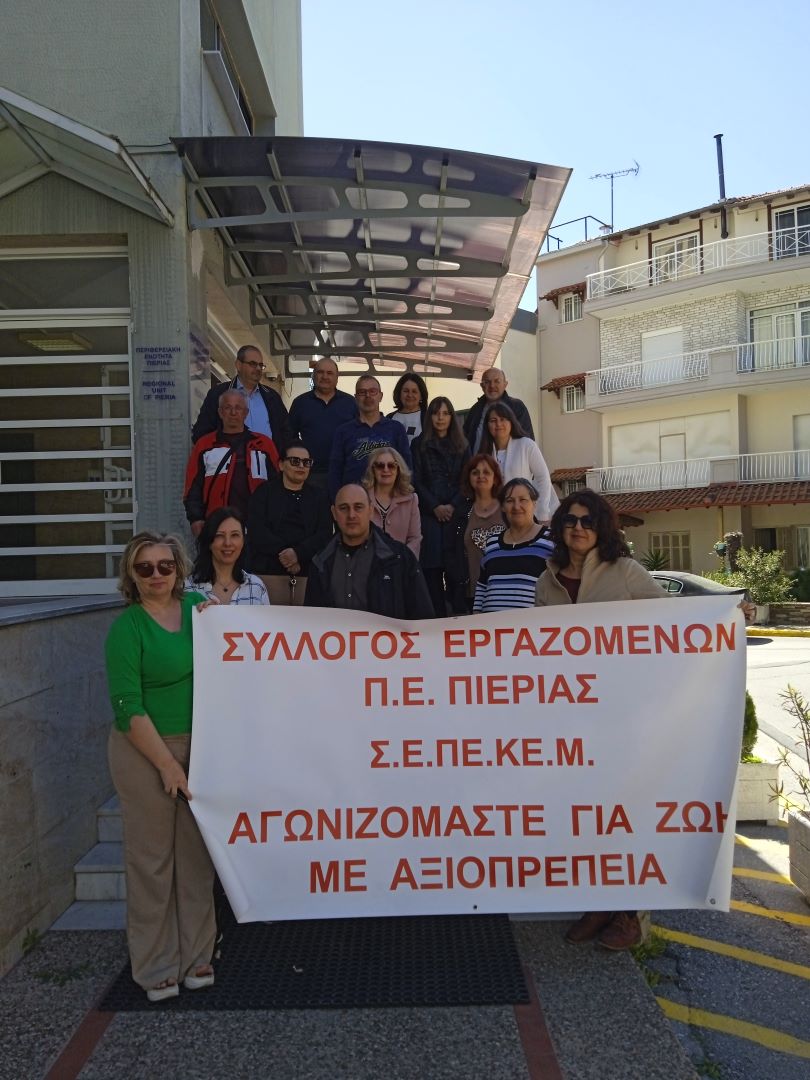 To Toπικό Τμήμα Πιερίας του Συλλόγου Εργαζομένων Περιφέρειας Κεντρικής Μακεδονίας πραγματοποίησε στις 4 Απριλίου και ώρα 13:30 συγκέντρωση διαμαρτυρίας έξω από το κεντρικό κτίριο των υπηρεσιών της Περιφερειακής Ενότητας Πιερίας. Η κίνηση αυτή έγινε στο πλαίσιο της Πανελλαδικής ημέρας Δράσης και Αγωνιστικής διεκδίκησης που κήρυξε η ΟΣΥΑΠΕ, Ομοσπονδία Συλλόγων Υπαλλήλων Αιρετών Περιφερειών Ελλάδας. Στα αιτήματα της Ομοσπονδίας συμπεριλαμβάνονται οι προσλήψεις μόνιμου προσωπικού, οι αυξήσεις στους μισθούς πάνω από τον πληθωρισμό, η επαναφορά του 13ου & 14ου μισθού, η λήψη μέτρων κατά της ακρίβειας, η ικανοποίηση των αιτημάτων μας για τα ζητήματα των μετακινήσεων των υπαλλήλων που εκτελούν εξωτερική υπηρεσία, η χορήγηση «ελεγκτικού επιδόματος» στους ελεγκτικούς μηχανισμούς και τις υποστηρικτικές δομές, η πλήρης νομική κάλυψη κ.α..
