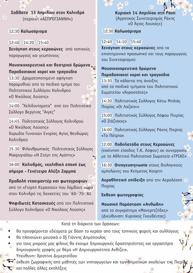 Πολυποίκιλο πρόγραμμα υπό το φως της γοητείας των ανθέων που απλόχερα αναδεικνύουν οι κερασιές, ως το πρώτο ανθισμένο δέντρο προπομπός της άνοιξης, περιλαμβάνει το πρόγραμμα του διημέρου 13 και 14 Απριλίου 2024 σε δύο κερασοφόρες περιοχές της Πιερίας, τον Κολινδρό και τη Ράχη, όπου θα υλοποιηθεί η δράση «Ανθισμένες Κερασιές της Πιερίας» με διοργανωτές την Περιφερειακή Ενότητα Πιερίας και τον Πιερικό Οργανισμό Τουριστικής Ανάπτυξης και Προβολής (ΠΟΤΑΠ).