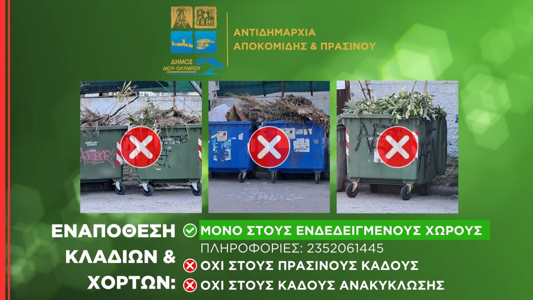 Δήμος Δίου-Ολύμπου: Υπενθύμιση προς τους δημότες για εναπόθεση κλαδιών και χόρτων στους ενδεδειγμένους χώρους και όχι στους πράσινους κάδους και κάδους ανακύκλωσης