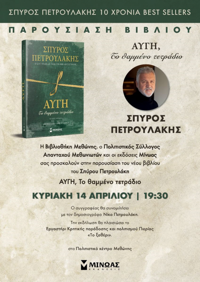 Φέτος, γιορτάζουμε 10 επιτυχημένα χρόνια στην ελληνική πεζογραφία, με το νέο κοινωνικό μυθιστόρημα, «Αυγή, Το θαμμένο τετράδιο» που διηγείται μία ιστορία με φόντο το Παλαιό Τρίκερι Μαγνησίας και σας προσκαλούμε στο Πολιτιστικό Κέντρο Μεθώνης, την Κυριακή 14 Απριλίου στις 19:30.