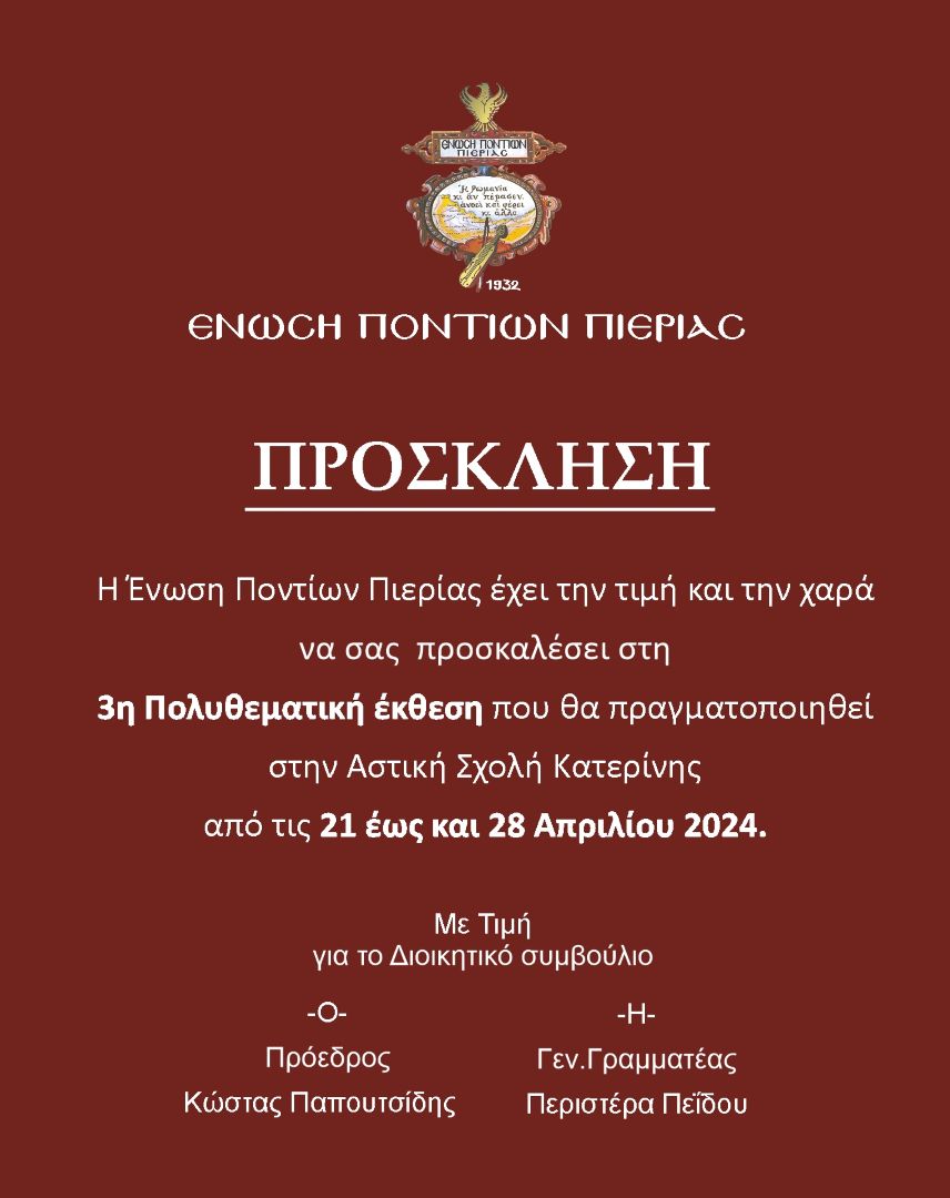 Πρόσκληση και Πρόγραμμα Πολυθεματικής Έκθεσης της Ένωσης Ποντίων Πιερίας