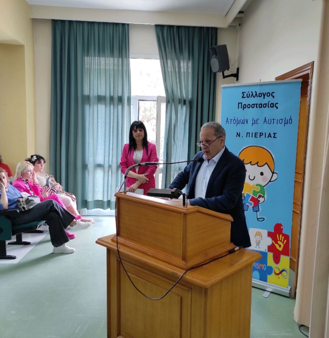 Παράλληλα όπως απευθυνόμενος στην πρόεδρο του Συλλόγου Ατόμων με Αυτισμό Ν. Πιερίας, ο κος Γεωργιάδης σημείωσε: «Γνώρισα τον αυτισμό μέσα από το επάγγελμα μου, ως φυσικοθεραπευτής. Μια μορφή αναπηρίας με πολλαπλές εκφάνσεις που θέτει καθημερινές προκλήσεις στην οικογένεια του προσώπου με αυτισμό και στους επαγγελματίες που εργάζονται με τον αυτισμό. Συνταγή επιτυχίας δεν υπάρχει. Υπάρχει όμως ο κοινός στόχος. Να αγκαλιάζουμε όλοι τα άτομα με αυτισμό και να τα θεωρούμε ενεργά μέλη της κοινωνίας μας. Μόνο έτσι θα καταφέρουμε να πετύχουμε τον στόχο της ορατότητας. Θέλω να πω ένα μεγάλο μπράβο στον Σύλλογο σας για το μεράκι που διαθέτει και που με πενιχρά μέσα και πολλή προσωπική δουλειά καταφέρατε να πετύχετε πολλά σε μικρό χρονικό διάστημα. Από τη μεριά μου θα ήθελα να πω ότι θα είμαστε δίπλα σας σε ό,τι χρειαστείτε, μεταφέροντας και τα συγχαρητήρια του Δημάρχου μας, Γιάννη Ντούμου για όσα έχετε καταφέρει».