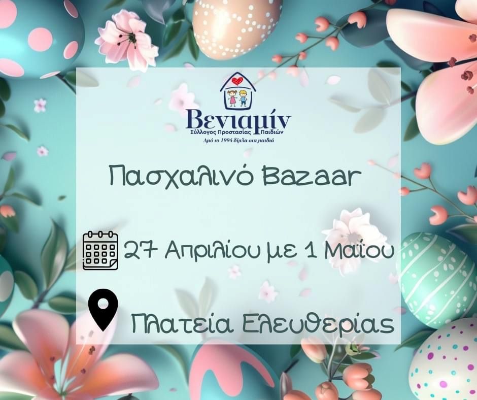Ο Σύλλογος Προστασίας Παιδιών ΒΕΝΙΑΜΙΝ ανακοινώνει και φέτος τη διοργάνωση ενός μοναδικού Πασχαλινού Bazaar που θα λάμψει από την αγάπη και τη δημιουργικότητα των εθελοντών μας.