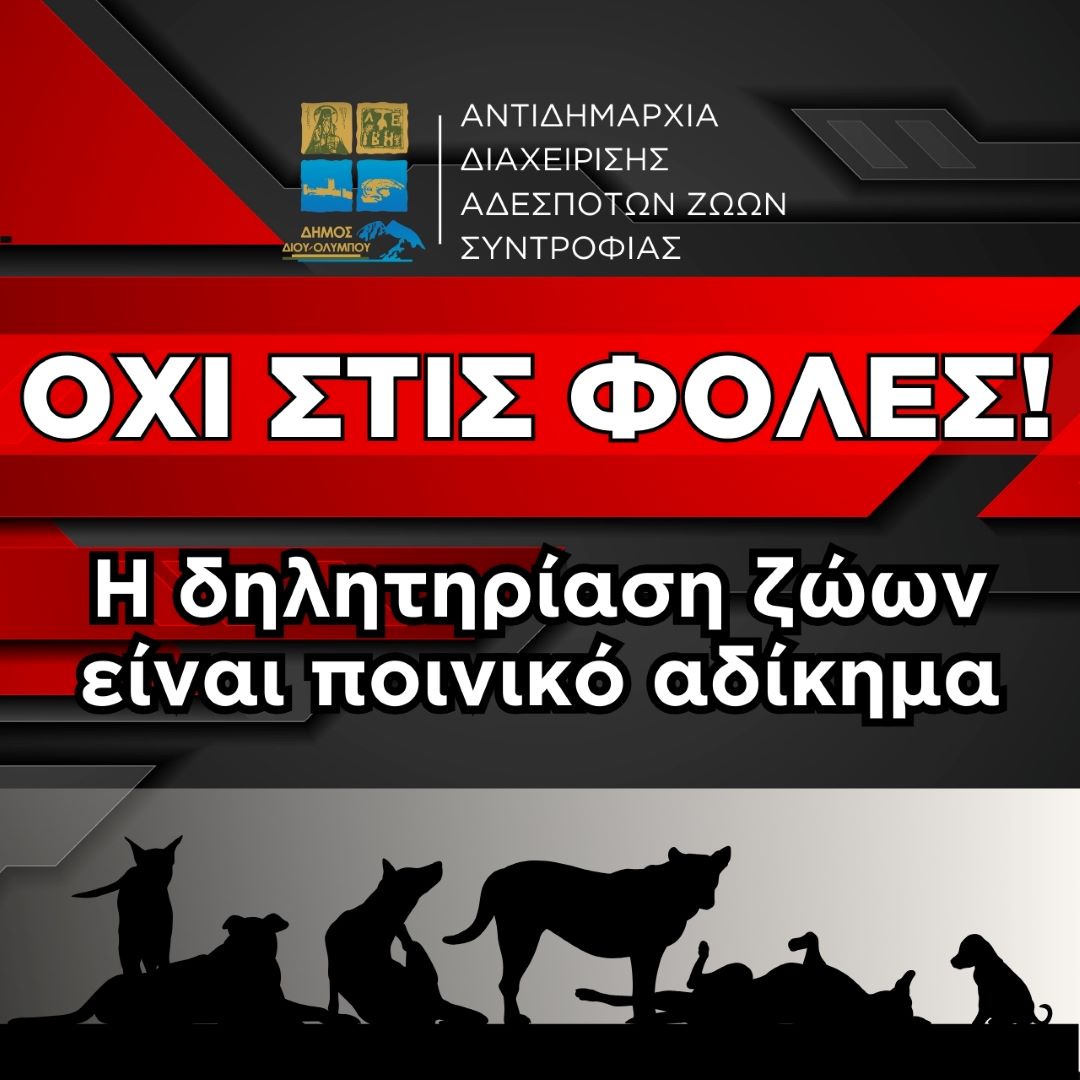Η Αντιδημαρχία Διαχείρισης Αδέσποτων Ζώων Συντροφιάς Δήμου Δίου-Ολύμπου καταδικάζει απερίφραστα κάθε προσπάθεια κακοποίησης ζώων, υπογραμμίζοντας ότι θα προβεί σε όλες τις νόμιμες ενέργειες κατά των δραστών.