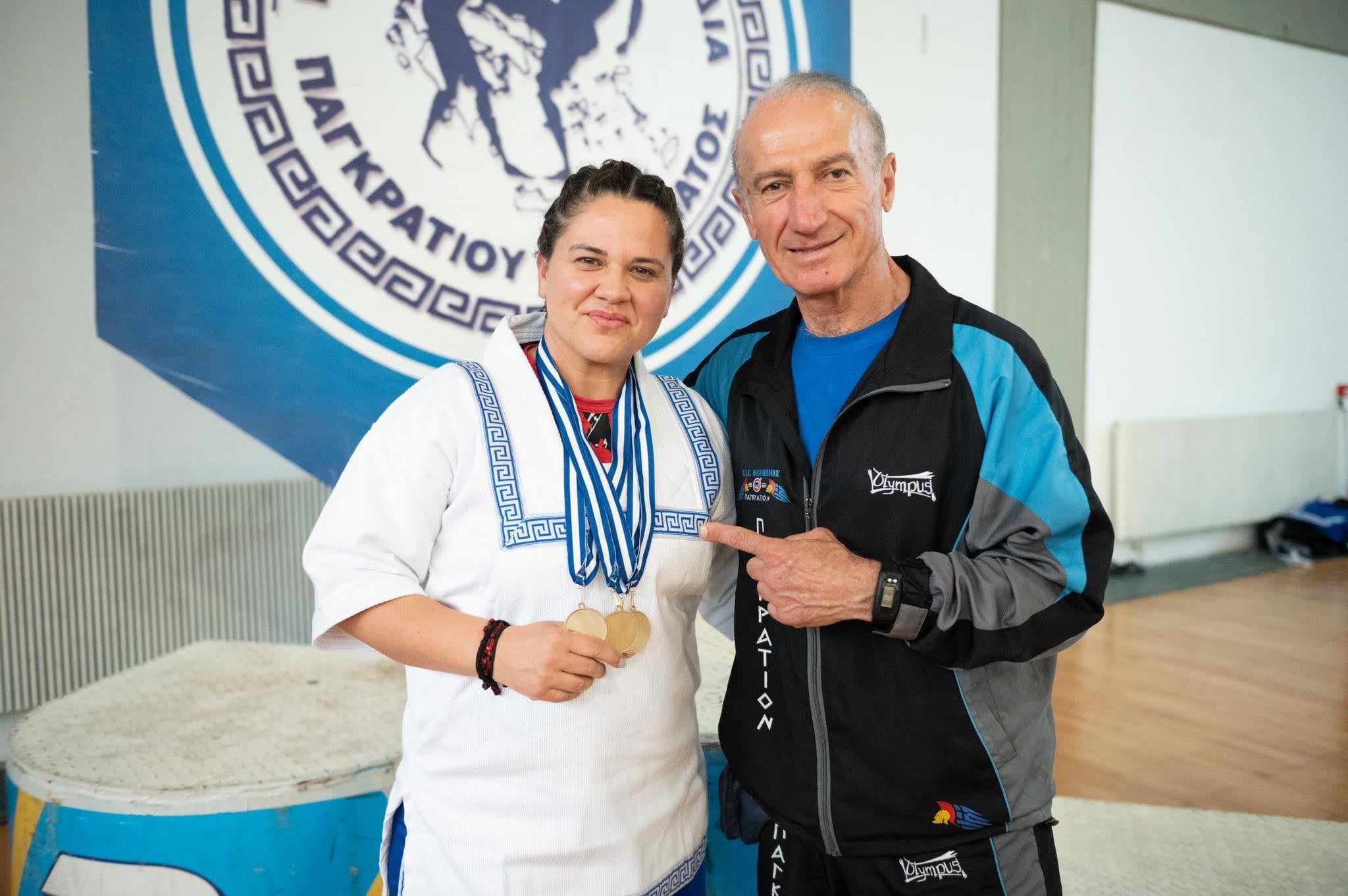Φροντίστρια στους αγώνες, βοηθός προπονητή, η Κρουσταλούδη Αγγελική, μια νέα δυναμική παρουσία στον χώρο του παγκρατίου από την Θεσσαλονίκη.