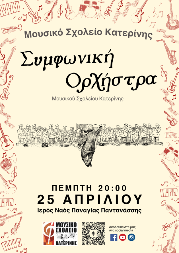 Στις 25 Απριλίου και ώρα 8 μ.μ. στην Αίθουσα του Ιερού Ναού Παντανάσσης η Συμφωνική Ορχήστρα του Μουσικού Σχολείου Κατερίνης σε ένα πρόγραμμα κινηματογραφικής μουσικής με έργα των: Ν. Piovani, N. Rota, K. Badelt, Α. Κεραμάρης, J. Williams, M. Giacchino, A. Menken, E. Morricone. Την ορχήστρα διευθύνει ο εκπαιδευτικός Δημήτρης Ζαχαράκης και τα παιδιά συνοδεύουν οι υπεύθυνοι καθηγητές της ορχήστρας.