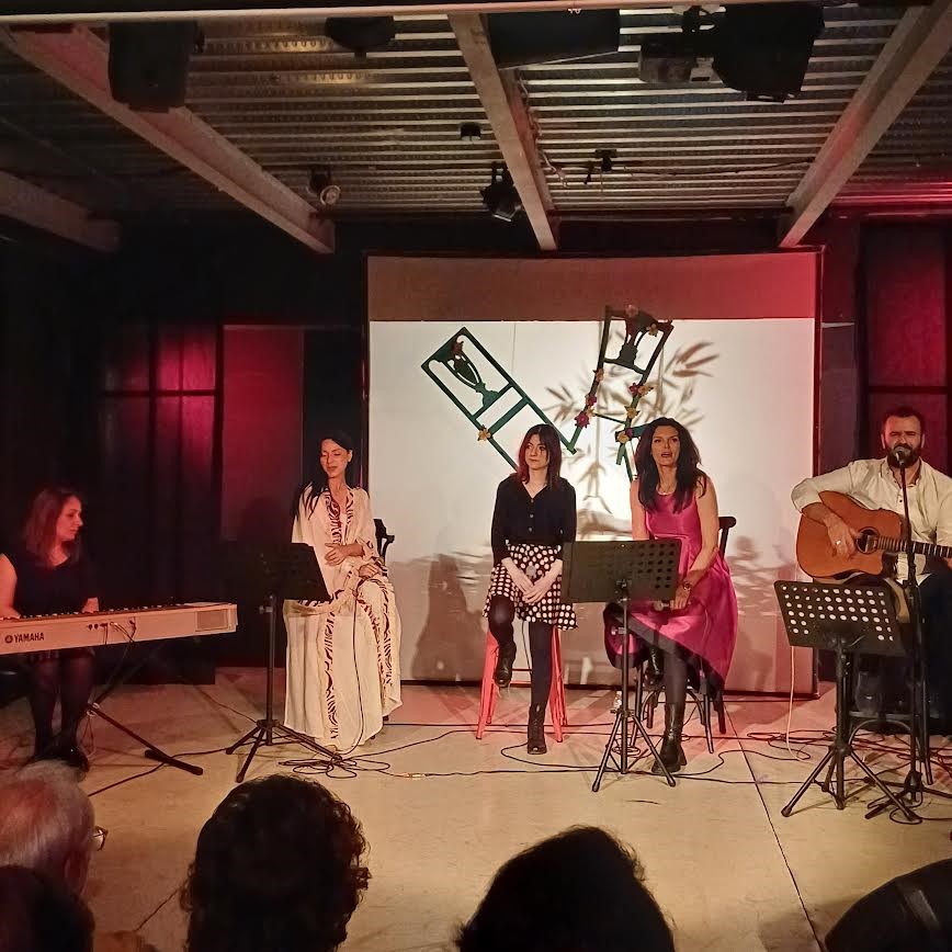 Στο κατάμεστο θέατρο Commedia, οι κυρίες της Εστίας Ιωάννα Ηλιάδου, Μαρία Τσομπανοπούλου και Μαρία Βούλγαρη μας χάρισαν μια βραδιά απολαυστική και συγκινητική. Τις γυναικείες φωνές συνόδευσε στο τραγούδι με την κιθάρα του, ο Θανάσης Μπατάλας  ο οποίος μας τραγούδησε και δικά του κομμάτια, ενώ η Εκατερίνα Ελενίδη Karchilava στο πιάνο, ανέδειξε για ακόμη μία φορά τις καλλιτεχνικές της ικανότητες.