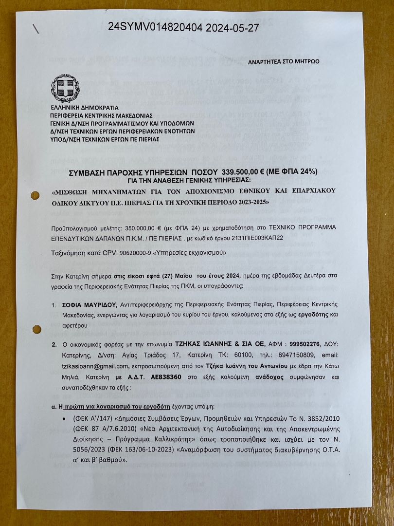 Τη Δευτέρα, 27 Μαΐου 2024, υπεγράφη η σύμβαση μεταξύ της Περιφερειακής Ενότητας Πιερίας και του αναδόχου μετά από διεθνή ανοιχτό διαγωνισμό, για την υλοποίηση του έργου με τίτλο “Μίσθωση μηχανημάτων για τον αποχιονισμό εθνικού κι επαρχιακού οδικού δικτύου Π.Ε. Πιερίας για τη χρονική περίοδο 2023-2025”. Το εν λόγω έργο με κωδικό 2131ΠΙΕ003ΚΑΠ22 χρηματοδοτείται από το Τεχνικό Πρόγραμμα Επενδυτικών Δαπανών Π.Κ.Μ./ΠΕ Πιερίας και αφορά σε υπηρεσίες εκχιονισμού.