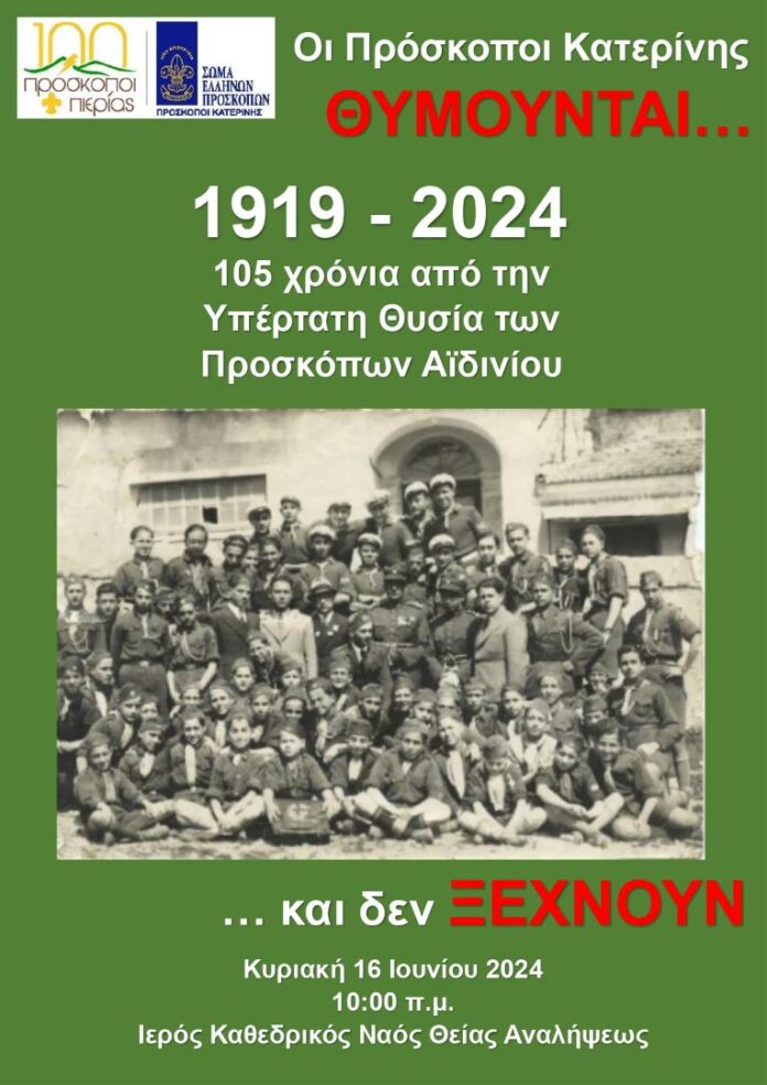 Κυριακή 16 Ιουνίου 2024 και ώρα 10:00 στον Ιερό Καθεδρικό Ναό Θείας Αναλήψεως θα πραγματοποιηθεί επιμνημόσυνη δέηση προς τιμή των αδικοχαμένων Προσκόπων στο Αϊδίνη της Μικράς Ασίας.