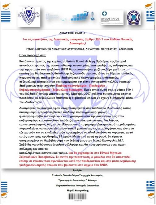 Στο πλαίσιο αυτό ανακοινώνεται ότι, το παρακάτω κείμενο – μήνυμα που διακινείται μέσω ηλεκτρονικού ταχυδρομείου (email), ως δήθεν επιστολή αξιωματούχων της Ελληνικής Αστυνομίας ή άλλων ευρωπαϊκών και διεθνών οργανισμών, με αναφορά σε υπηρεσίες της Ελληνικής Αστυνομίας («Γενική Διεύθυνση Δικαστικής Αστυνομίας», «Διεύθυνση Προστασίας Ανηλίκων») είναι καταφανώς ψευδεπίγραφο και απατηλό και αποστέλλεται από δράστες που επιχειρούν προφανώς να εξαπατήσουν – παραπλανήσουν τους πολίτες και ακολούθως να αποκομίσουν παράνομο οικονομικό όφελος.