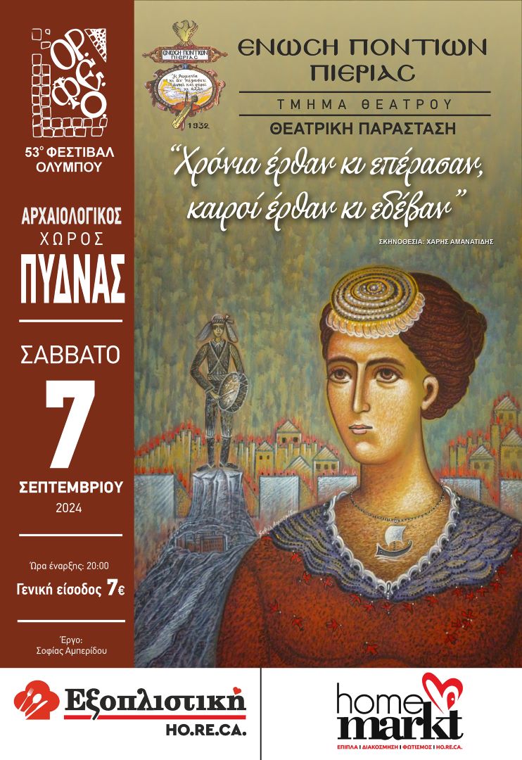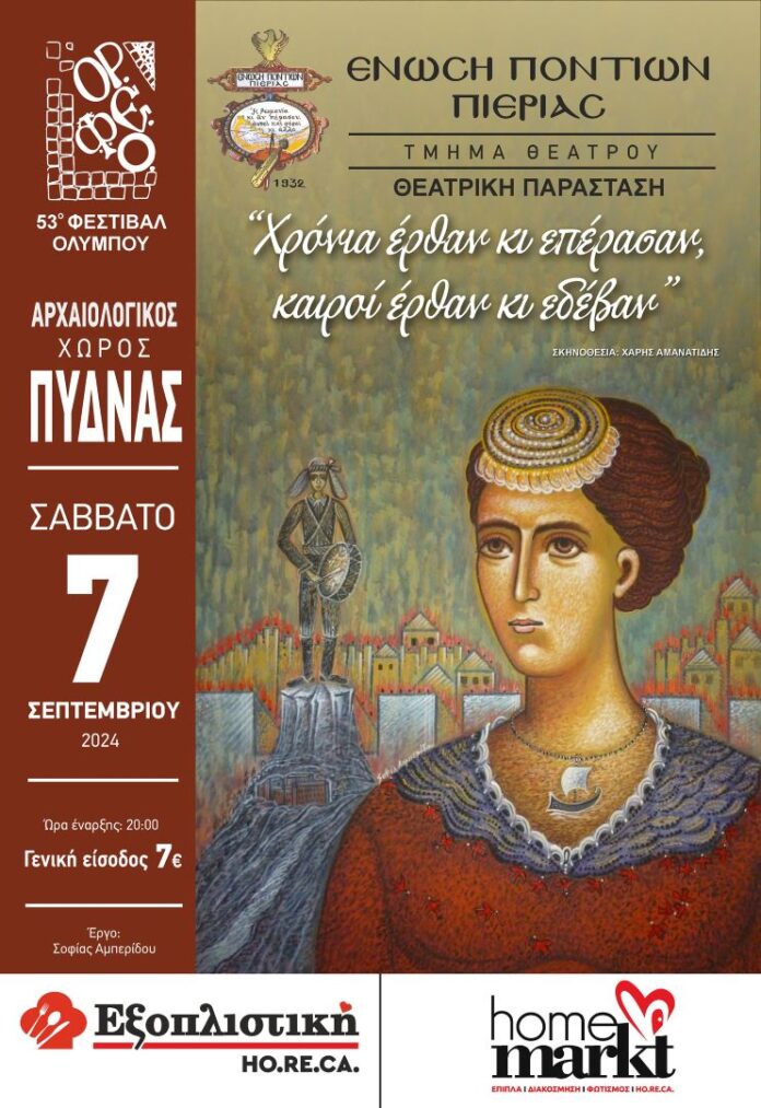 Η Ένωση Ποντίων Πιερίας στο πλαίσιο των εκδηλώσεων του 53ου Φεστιβάλ Ολύμπου, έχει την τιμή και την χαρά να σας προσκαλέσει το Σάββατο 7 Σεπτεμβρίου 2024 και ώρα 20:00 στον Αρχαιολογικό χώρο της Πύδνας να παρακολουθήσετε τη μοναδική νέα Ποντιακή θεατρική παράσταση από το θεατρικό τμήμα του συλλόγου,