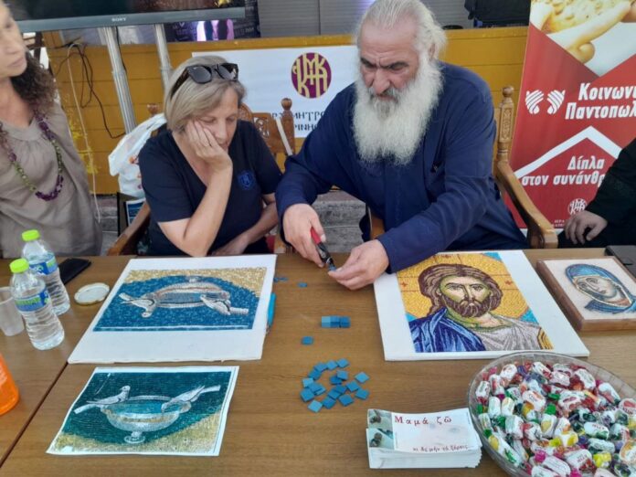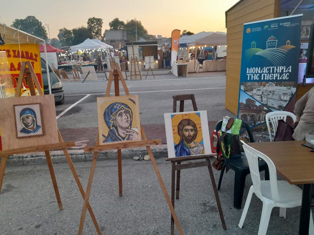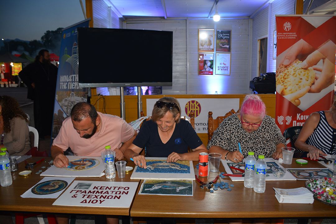 Στην αναβαθμισμένη εμποροπανήγυρη του Δήμου Κατερίνης η Ιερά Μητρόπολη Κατερίνης, Κίτρους και Πλαταμώνος και το Κέντρο Γραμμάτων και Τεχνών Δίου πραγματοποιήσαν την Τρίτη 27 Αυγούστου τη δράση επίδειξης της τέχνης του ψηφιδωτού.