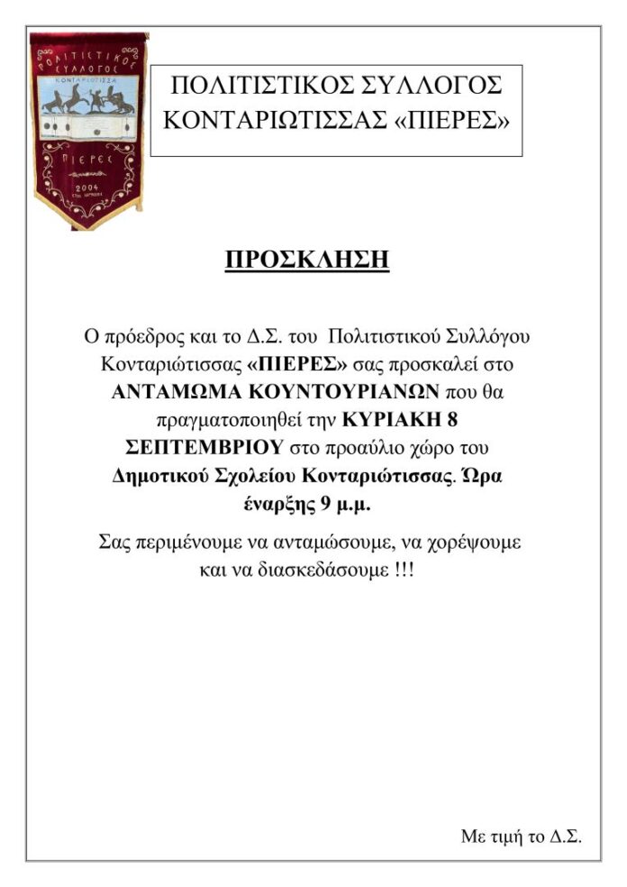 Ο πρόεδρος και το Δ.Σ. του Πολιτιστικού Συλλόγου Κονταριώτισσας «Πίερες» σας προσκαλούν στο «Αντάμωμα Κουντουριανών» που θα πραγματοποιηθεί την Κυριακή 8 Σεπτεμβρίου στον προαύλιο χώρο του Δημοτικού Σχολείου Κονταριώτισσας.