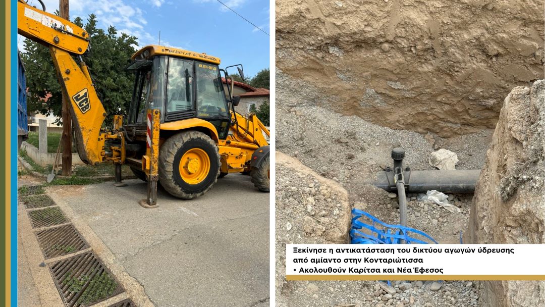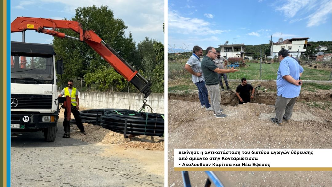 Ξεκίνησε η υλοποίηση του έργου αντικατάστασης του δικτύου ύδρευσης από αμίαντο στη δημοτική κοινότητα Κονταριώτισσας. Το έργο περιλαμβάνει την αντικατάσταση παλιών αγωγών πόσιμου νερού (40ετίας) στις δημοτικές κοινότητες Κονταριώτισσσας, Καρίτσας και Νέας Εφέσου, μήκους περίπου 13,8 χλμ καθώς και δημιουργία 800 ιδιωτικών συνδέσεων ύδρευσης.