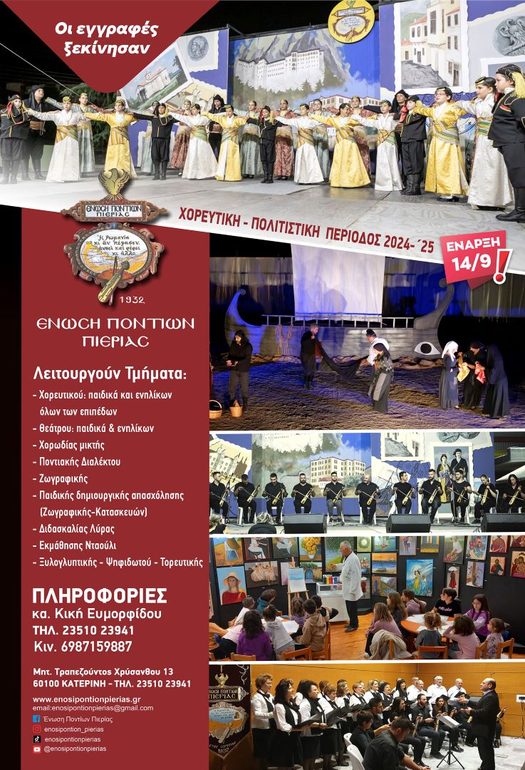 Η Ένωση Ποντίων Πιερίας ανακοινώνει στα μέλη και στους φίλους του συλλόγου την έναρξη λειτουργίας της νέας Πολιτιστικής περιόδου, από τις 14 Σεπτεμβρίου 2024.
