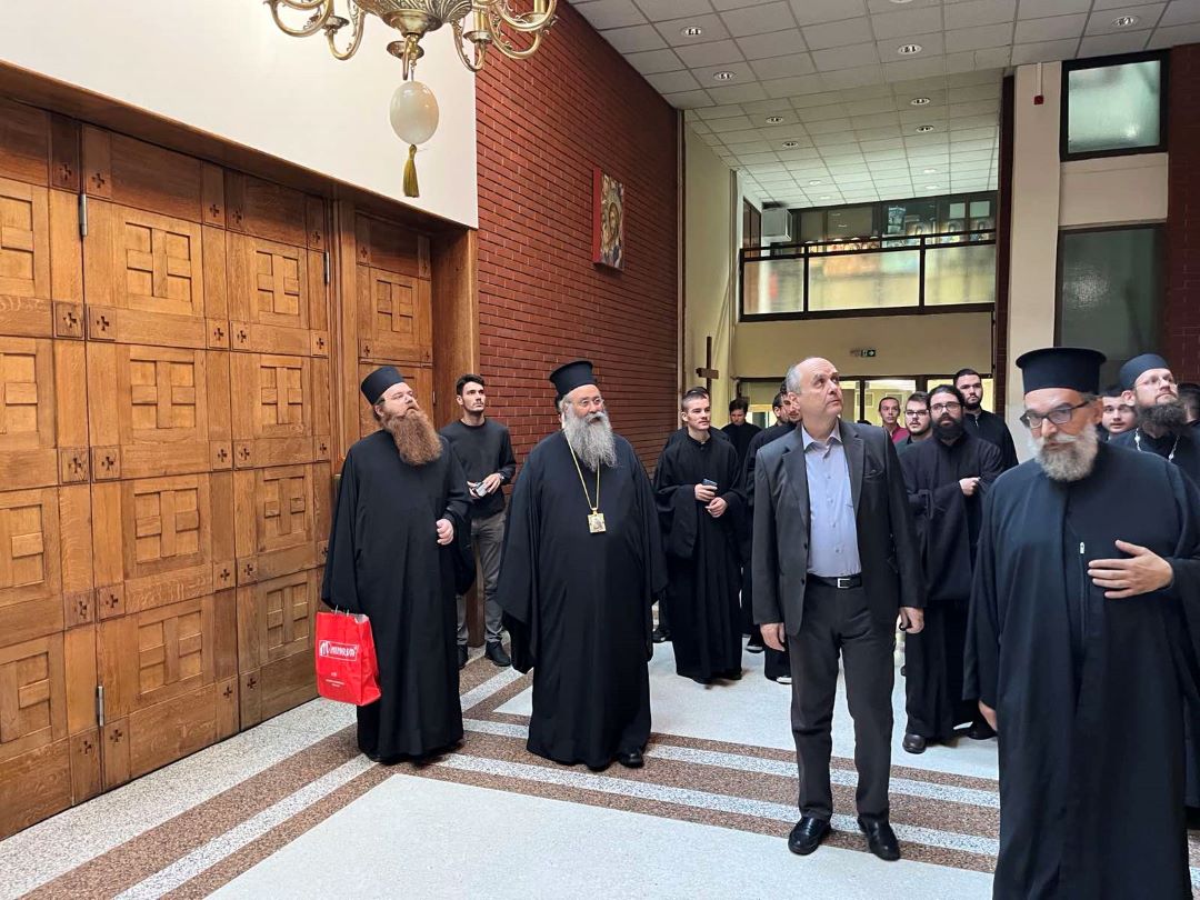 Τον Σεβασμιώτατο υποδέχθηκαν στην είσοδο της Σχολής καθηγητές και φοιτητές, οι οποίοι τον οδήγησαν στον Ιερό Ναό Αγίου Ιωάννου Θεολόγου, ο οποίος λειτουργεί εντός της Θεολογικής Σχολής για την πρακτική άσκηση των φοιτητών.
