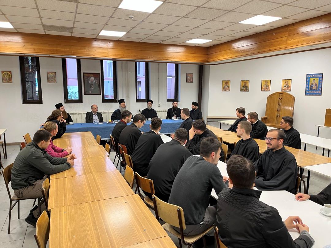 Στη συνέχεια, όλοι μαζί μετέβησαν σε αίθουσα, όπου πραγματοποιήθηκε μια ιδιαίτερα δημιουργική συνάντηση γνωριμίας και επικοινωνίας. Στη συνάντηση παρέστη και ο Έλληνας Πρωτοπρεσβύτερος π. Παναγιώτης Καρατάσιος, ο οποίος ιερουργεί στο Βελιγράδι.
