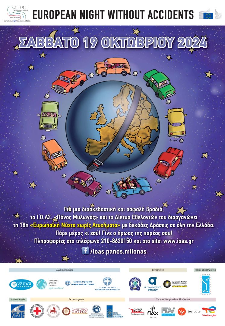 To Ινστιτούτο Οδικής Ασφάλειας (Ι.Ο.ΑΣ.) «Πάνος Μυλωνάς» συνεχίζει δυναμικά τις δράσεις ενεργοποίησης και ευαισθητοποίησης των πολιτών για «έναν κόσμο χωρίς τροχαία δυστυχήματα». Έτσι, το Σάββατο 19 Οκτωβρίου 2024, διοργανώνει, όπως κάθε χρόνο, τη 18η «Ευρωπαϊκή Νύχτα χωρίς Ατυχήματα» σε μεγάλες πόλεις στην Ελλάδα.