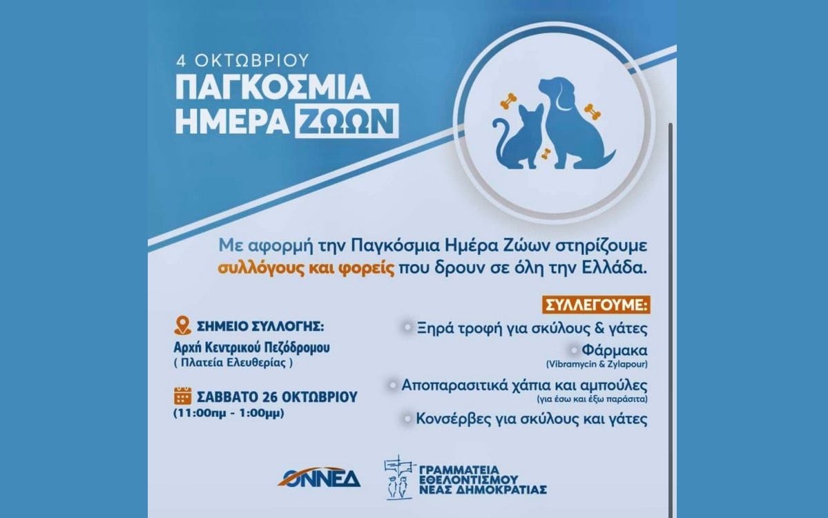 Με αφορμή την Παγκόσμια Ημέρα Ζώων, η Γραμματεία Εθελοντισμού της Νέας Δημοκρατίας διοργανώνει μια δράση συγκέντρωσης τροφών και φαρμάκων για τα αδέσποτα ζώα, στηρίζοντας τα πέντε φιλοζωικά σωματεία του νομού, όπου τα υλικά που θα συγκεντρωθούν θα διανεμηθούν άμεσα!