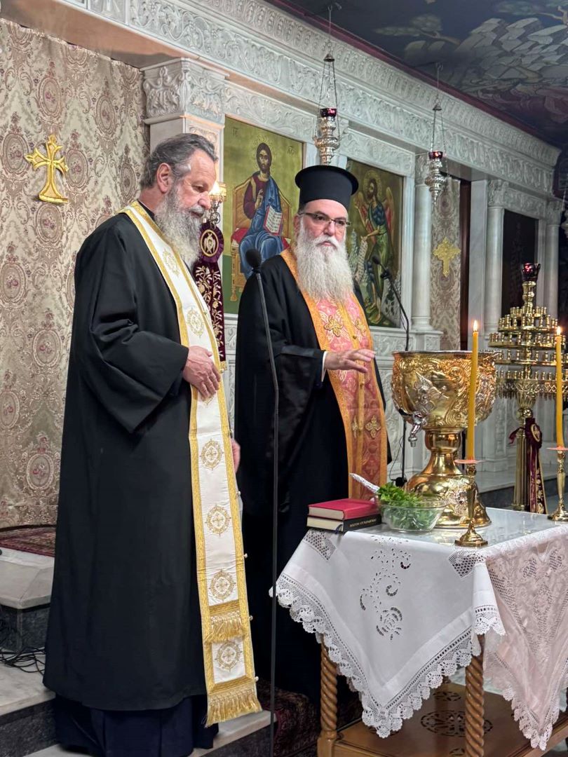Πιο συγκεκριμένα, το απόγευμα της Κυριακής στον Ιερό Ναό του Αγίου Αποστόλου Βαρνάβα (κάτωθεν του Καθεδρικού),  ο Πρωτοσύγκελλος της Ιεράς Μητροπόλεως Κίτρους, Κατερίνης και Πλαταμώνος Αρχιμανδρίτης π. Βαρνάβας Λεοντιάδης,  εκπροσωπώντας τον εορτάζοντα Σεβασμιώτατο Μητροπολίτη κ. Γεώργιο,  τέλεσε τον αγιασμό
