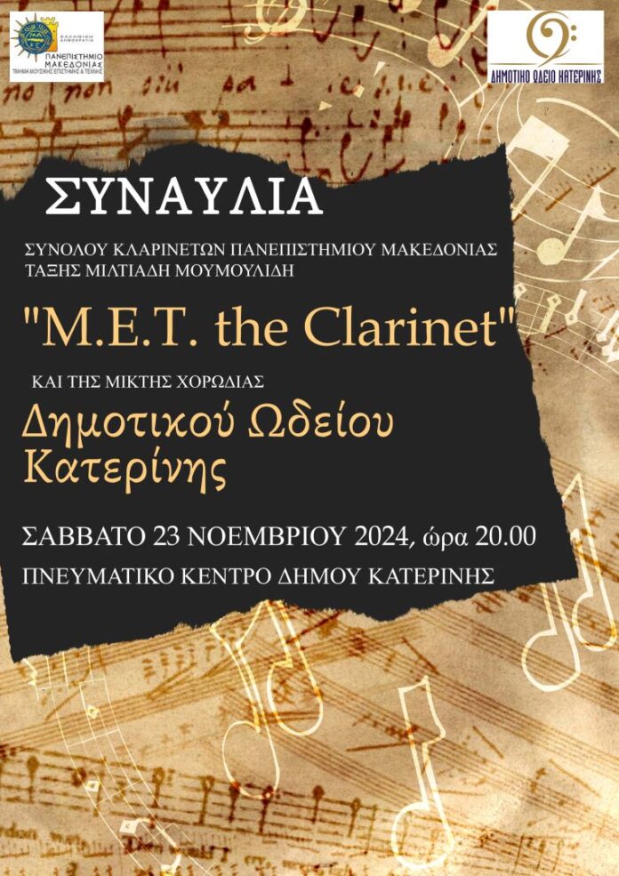 Στη συναυλία θα εμφανιστούν το Σύνολο Κλαρινέτων “M.E.T the Clarinet” του Πανεπιστημίου Μακεδονίας, υπό τη διεύθυνση του Μίλτου Μουμουλίδη, καθώς και η Μικτή Χορωδία του Δημοτικού Ωδείου Κατερίνης, υπό τη διεύθυνση του Ιωάννη Κούκα.