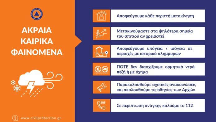 Η Γενική Γραμματεία Πολιτικής Προστασίας συνιστά στους πολίτες να είναι ιδιαίτερα προσεκτικοί, μεριμνώντας για τη λήψη μέτρων αυτοπροστασίας από κινδύνους που προέρχονται από την εκδήλωση των έντονων καιρικών φαινομένων. Ειδικότερα: