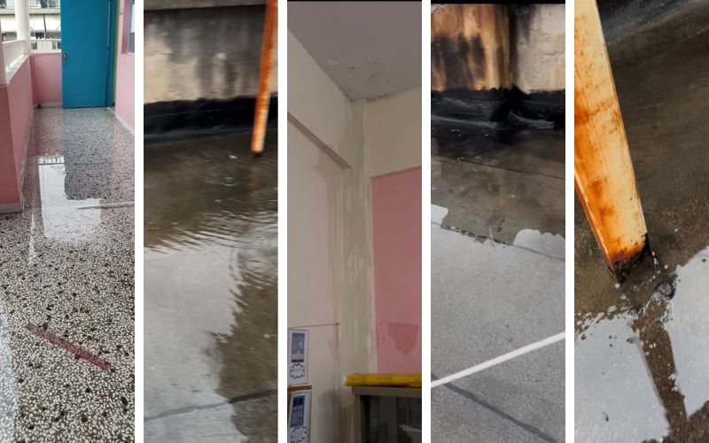 Οι αίθουσες του δευτέρου ορόφου του σχολείου θυμίζουν … πισίνα από την εισροή όμβριων υδάτων προερχόμενα από την ταράτσα του κτιρίου που δεν διαθέτει τις ανάλογες κλίσεις για την απορροή τους.