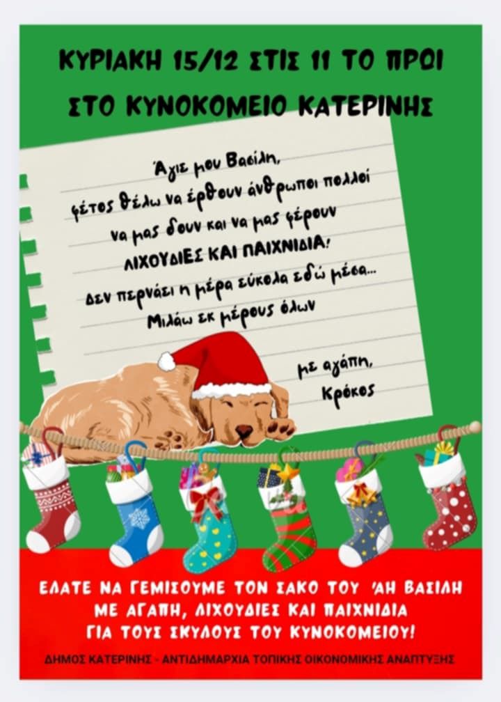 Η προγραμματισμένη για αύριο Κυριακή, Γιορτή στο  Κυνοκομείο Κατερίνης αναβάλλεται λόγω καιρικών συνθηκών και θα πραγματοποιηθεί την Κυριακή  15 Δεκεμβρίου.