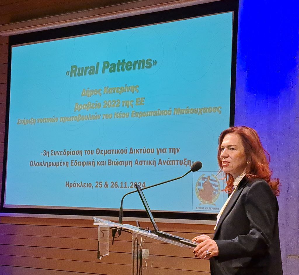 Στη συνεδρίαση παραβρέθηκε και συμμετείχε στις παρουσιάσεις, η Προϊσταμένη του Τμήματος Προγραμματισμού, Ανάπτυξης και Οργάνωσης Κατερίνα Πόδα, εκ μέρους του Δήμου Κατερίνης, μέλους του Δικτύου. Το βραβευμένο με New European Bauhaus prize της ΕΕ, “Rural Patterns” του Δήμου Κατερίνης, αποτέλεσε για άλλη μία φορά σημείο ενδιαφέροντος και παράδειγμα προς μίμηση για τα μέλη του Δικτύου. Όπως ανέφερε η Κατερίνα Πόδα: «Με το βραβείο NEB κάναμε μια καλή αρχή. Η πόλη μας συζητιέται, κινεί το ενδιαφέρον και εκπλήσσει. Οι επιβραβεύσεις είναι συνεχείς, οι χρηματοδοτήσεις μόλις άρχισαν. Αναμένεται να δείξουμε σοβαρότητα, ετοιμότητα, επάρκεια και αποτελεσματικότητα στην πορεία υλοποίησης του βραβευμένου μας έργου, ώστε να πείσουμε για την διεύρυνση της χρηματοδότησης. Στόχος μας είναι η ανάπλαση του συνόλου του δημοσίου χώρου του κέντρου της πόλης μας και εργαζόμαστε μεθοδικά να τον πετύχουμε.»