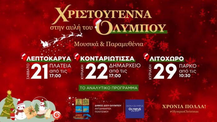 Ο Δήμος Δίου-Ολύμπου σας προσκαλεί στις τρεις κεντρικές χριστουγεννιάτικες εκδηλώσεις του, που θα πραγματοποιηθούν αντίστοιχα στις πρωτεύουσες των τριών δημοτικών ενοτήτων, σε Κονταριώτισσα, Λεπτοκαρυά και Λιτόχωρο.