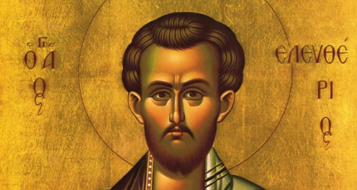 Ο Άγιος Ελευθέριος ήταν από την πόλη της Ρώμης, πολύ νέος στην ηλικία, ορφανός από πατέρα, που είχε μόνη τη μητέρα του, στο όνομα Ανθία, η οποία είχε κατηχηθεί στην πίστη του Χριστού από τον άγιο απόστολο Παύλο.