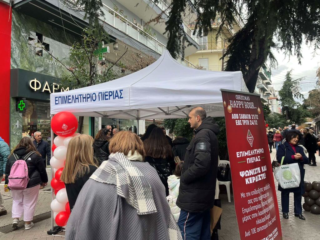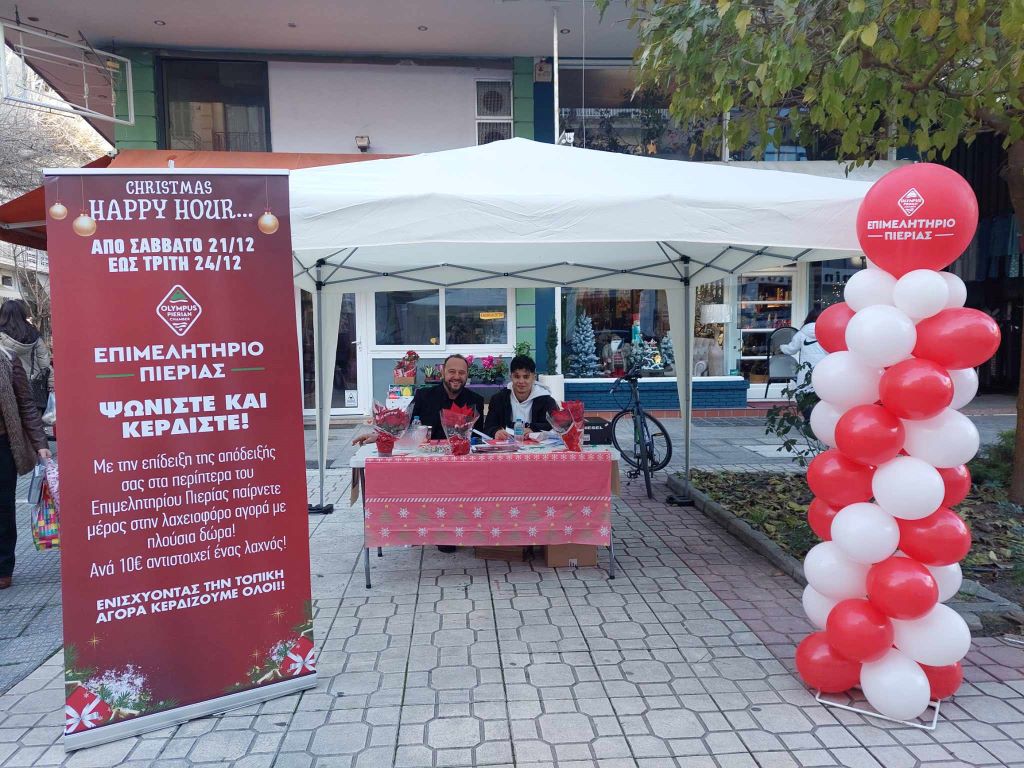 Με μεγάλη επιτυχία και ανταπόκριση από τους καταναλωτές, συνεχίζεται η γιορτινή δράση «CHRISTMAS HAPPY HOUR», που διοργάνωσε το Επιμελητήριο Πιερίας. Πλήθος κόσμου ανταποκρίθηκε το σαββατοκύριακο που μας πέρασε στη χριστουγεννιάτικη δράση, η οποία θα διαρκέσει έως και την Τρίτη 24 Δεκεμβρίου, τις ώρες λειτουργίας των καταστημάτων και πραγματοποιείται σε κεντρικά σημεία, στα ειδικά περίπτερα του Επιμελητηρίου.