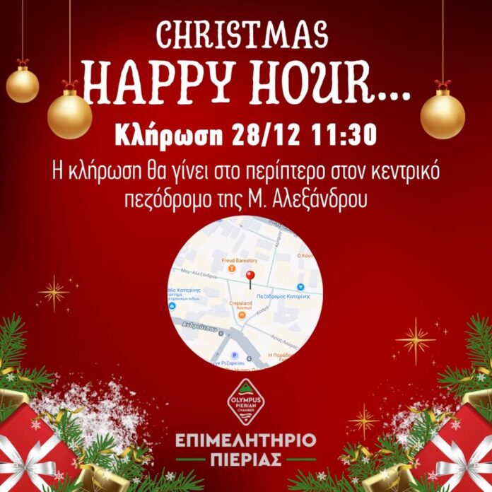 Με απόλυτη επιτυχία πραγματοποιήθηκε από τις 21/12 ημέρα Σάββατο έως την Τρίτη 24/12 παραμονή Χριστουγέννων η γιορτινή δράση του Επιμελητηρίου Πιερίας «CHRISTMAS HAPPY HOUR».