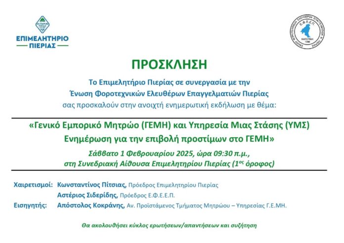 Ανοιχτή ενημερωτική εκδήλωση με θέμα «Γενικό Εμπορικό Μητρώο (ΓΕΜΗ) και Υπηρεσία Μιας Στάσης (ΥΜΣ) – Ενημέρωση για την επιβολή προστίμων στο ΓΕΜΗ», διοργανώνει το Επιμελητήριο Πιερίας σε συνεργασία με την Ένωση Φοροτεχνικών Ελευθέρων Επαγγελματιών Πιερίας.