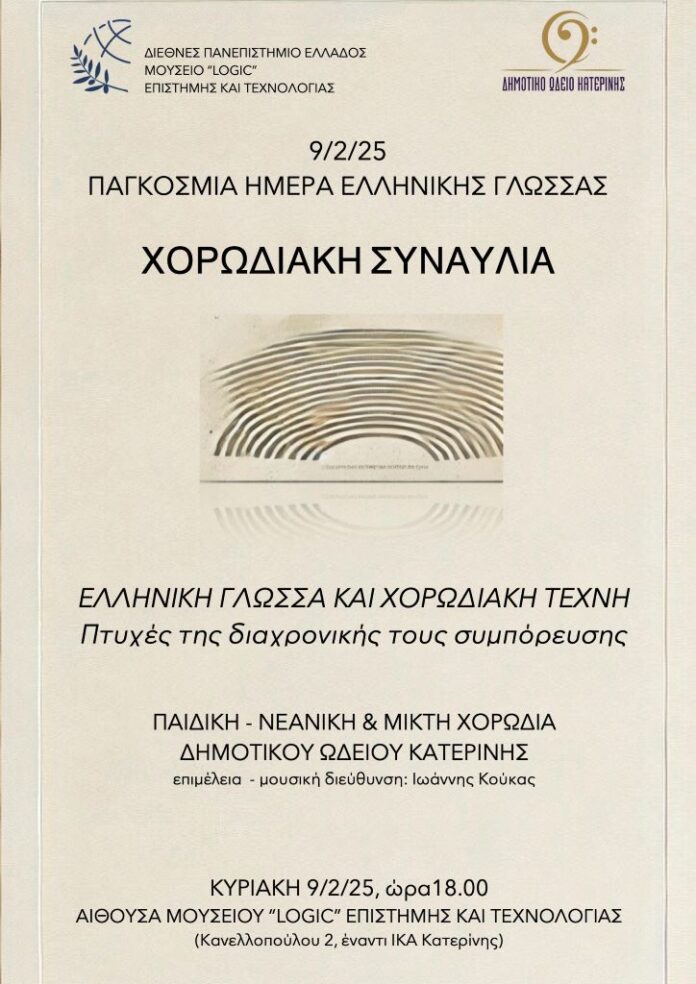 Την Παγκόσμια Ημέρα Ελληνικής Γλώσσας, θα τιμήσουν η Παιδική – Νεανική και η Μικτή Χορωδία του Δημοτικού Ωδείου Κατερίνης, την Κυριακή 9 Φεβρουαρίου και ώρα 18.00, πραγματοποιώντας μια ξεχωριστή συναυλία με τίτλο: