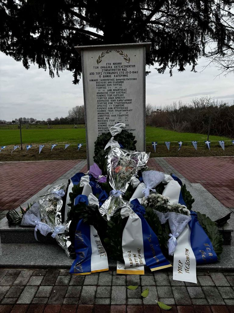 Στην εκδήλωση, που διοργάνωσε ο Δήμος Κατερίνης, στεφάνι κατέθεσαν: ο Βουλευτής Πιερίας, Κομνηνός Δελβερούδης (ως εκπρόσωπος της Βουλής των Ελλήνων), εκ μέρους του Δημάρχου Κατερίνης, Ι. Ντούμου – ο Πρόεδρος του Δημοτικού Συμβουλίου Κατερίνης, Χαράλαμπος Χρ. Μπρουσκέλης, εκ μέρους της Περιφερειακής Ενότητας Πιερίας, ο Περιφ. Σύμβουλος, (Τομεάρχης Επιστημονικών Φορέων Κ. Μακεδονίας), Αθανάσιος Λιακόπουλος, καθώς και εκπρόσωποι: του Δήμου Ελασσόνας (αναπλ. Δημάρχου, Δημήτριος Καρανίκας) & της Δημοτικής Κοινότητας Λιβαδίου Ελασσόνας (πρόεδρος, Κων/νος Ψαλίδας).