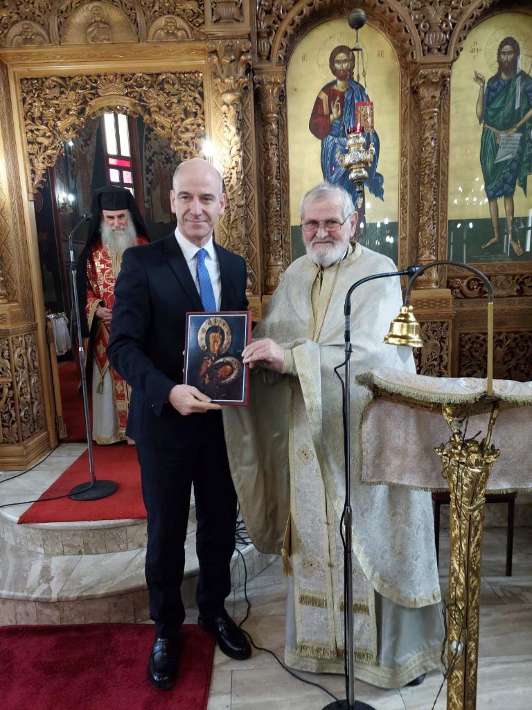Τέλος, ο π. Δημήτριος απένειμε ως ευλογία από ένα εικόνισμα της Αγίας Παρασκευής της Πολιούχου του Δίου, στους Βουλευτές Πιερίας, Κομνηνό Βελβερούδη και Φώντα Μπαραλιάκο.