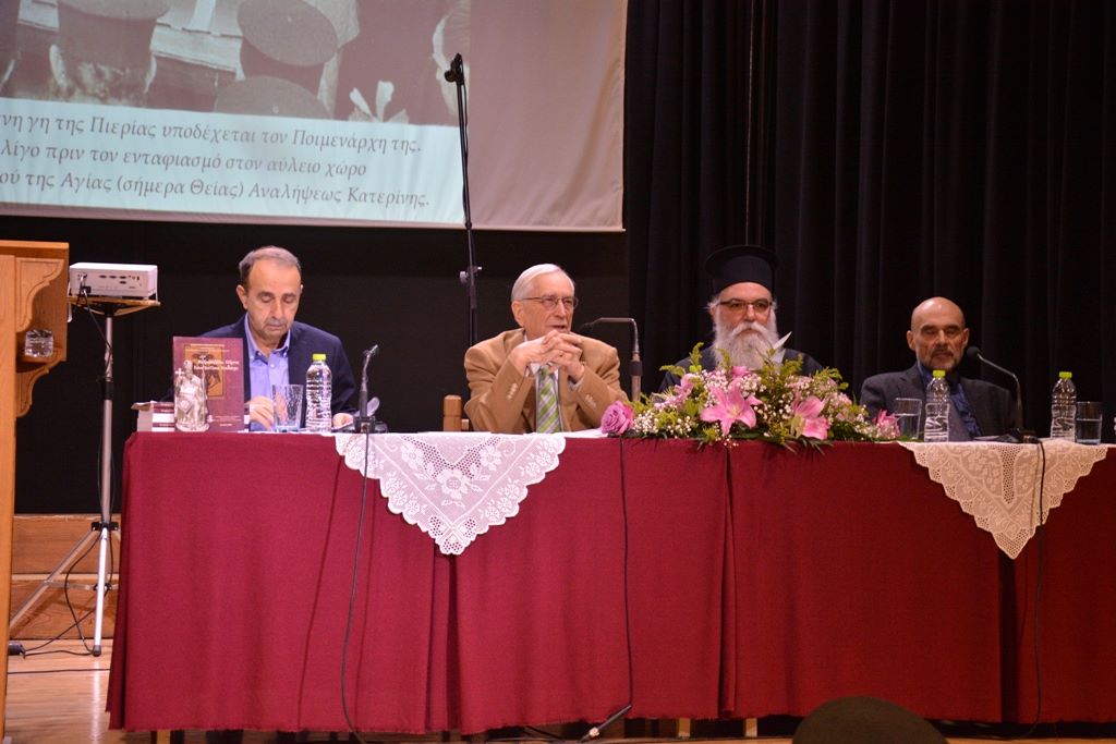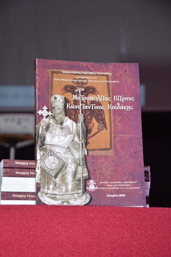 Η εκδήλωση ολοκληρώθηκε με την συγχαρητήρια και ευχαριστήρια παρέμβαση από τον Σεβασμιώτατο Μητροπολίτη Κίτρους, Κατερίνης και Πλαταμώνος κ. Γεώργιο, ο οποίος τόνισε χαρακτηριστικά: «Αξίζουν θερμά συγχαρητήρια στον Πρωτοσύγκελο της καθ΄ ημάς Μητροπόλεως Αρχιμανδρίτη π. Βαρνάβα για την αξιόλογη εργασία του η οποία κοσμεί και συμπληρώνει την εκκλησιαστική ιστορία της Πιερίας. Μελέτησε ενδελεχώς τις πηγές, εντρύφησε στα χειρόγραφα που φυλάσσονται στην Ιερά Μητρόπολη μας αλλά και αξιοποίησε άριστα κάθε διαχειρίσιμο πολύτιμο αρχείο. Ο Μητροπολίτης Κωνσταντίνος Κοϊδάκης ανέπτυξε ένα πλούσιο έργο από πλευράς ανοικοδόμησης Ιερών Ναών, αναμόρφωσης Μονών, και επέδειξε αξιοζήλευτη φιλανθρωπική διακονία, ενώ στήριξε οικονομικά τους αναξιοπαθούντες».