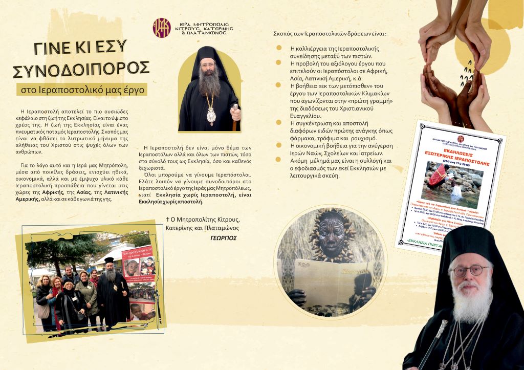 Οι φετινές εκδηλώσεις της Ιεράς Μητροπόλεως Κίτρους, Κατερίνης και Πλαταμώνος τονίζουν την αναγκαιότητα του έργου της Ορθόδοξης Εξωτερικής Ιεραποστολής και παρουσιάζουν την προσφορά της Εκκλησίας της Ελλάδος στο έργο του ευαγγελισμού των εθνών και στη ζωή των αδελφών Χριστιανών στην Αφρική και σε άλλες χώρες της Ιεραποστολής.