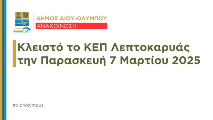 Από τον Δήμο Δίου-Ολύμπου ανακοινώνεται ότι το ΚΕΠ Λεπτοκαρυάς θα παραμείνει κλειστό την Παρασκευή 7 Μαρτίου 2025.