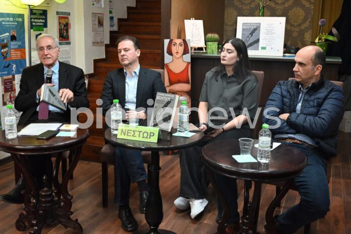 Στην κατάμεστη φιλόξενη αίθουσα του βιβλιοπωλείου “ΝΕΣΤΩΡ” πραγματοποιήθηκε την Τρίτη 18/03 το απόγευμα  η παρουσίαση του έβδομου βιβλίου του Πάνου Σόμπολου, στο πλαίσιο της περιοδείας του στην Βόρειο Ελλάδα.