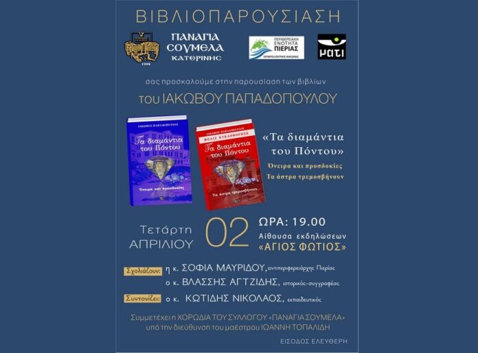 Η παρουσίαση των βιβλίων “Τα Διαμάντια του Πόντου” του Ιάκωβου Παπαδόπουλου, θα πραγματοποιηθεί την Τετάρτη, 2 Απριλίου 2025 και ώρα 19:00 στην αίθουσα εκδηλώσεων “Άγιος Φώτιος” στην πόλη της Κατερίνης. Η εκδήλωση της παρουσίασης των έργων του κου Παπαδόπουλου συνδιοργανώνεται από τον Σύλλογο “Παναγία Σουμελά Κατερίνης” και το βιβλιοπωλείο “Μάτι” και τελεί υπό την αιγίδα της Περιφερειακής Ενότητας Πιερίας, ενώ θα συμμετέχει και η Χορωδία του συλλόγου “Παναγία Σουμελά” υπό τη διεύθυνση του μαέστρου, κου Ιωάννη Τοπαλίδη.