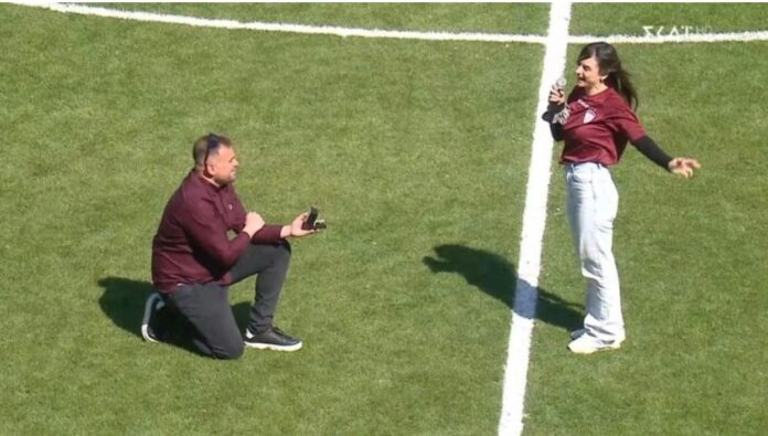 Στο ημίχρονο του ΑΕΛ – ΠΑΣ Γιάννινα δεν έλειψαν τα… ρομαντικά! Ο δημοσιογράφος του ΣΚΑΙ Λάρισας, Δημήτρης Πετρωτός, είχε υποσχεθεί πρόταση γάμου στην αγαπημένη του Ελένη, όταν η ομάδα του θα επέστρεφε στη Super League.
