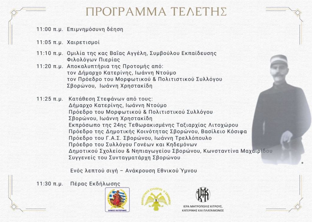 Αρχική Κατερίνη Τελετή αποκαλυπτηρίων της προτομής του Συνταγματάρχη Δημητρίου Σβορώνου (πρόσκληση – πρόγραμμα)