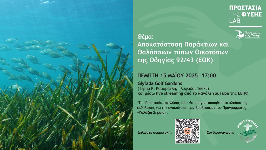 Η Ελληνική Εταιρία Προστασίας της Φύσης (ΕΕΠΦ) και ο Δήμος Γλυφάδας συνδιοργανώνουν την Πέμπτη 15 Μαΐου 2025, στο Glyfada Golf Gardens, δύο σημαντικές εκδηλώσεις αφιερωμένες στην προστασία του παράκτιου και θαλάσσιου περιβάλλοντος: την ανακοίνωση των βραβεύσεων του Προγράμματος «Γαλάζια Σημαία» για το 2025 και την τελευταία εκδήλωση του φετινού «Προστασία της Φύσης Lab» με θέμα «Αποκατάσταση Παράκτιων και Θαλάσσιων τύπων Οικοτόπων της Οδηγίας 92/43 (ΕΟΚ)».