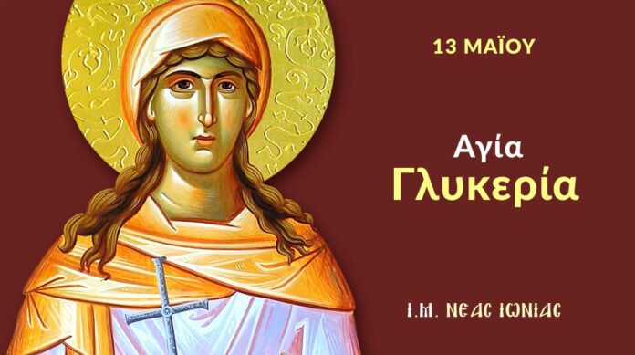 Η Αγία Γλυκερία γεννήθηκε στην Τραϊανούπολη το 2ον μ.Χ. αι., όταν αυτοκράτορας ήταν ο Αντωνίνος ο Ευσεβής (138 – 161 μ.Χ.). Ο πατέρας της ονομαζόταν Μακάριος και είχε διατελέσει ύπατος. Σε μικρή ηλικία, ασπάσθηκε το Χριστιανισμό και ανέπτυξε έντονη χριστιανική και κατηχητική δράση. Όταν πληροφορήθηκε το γεγονός ο ηγεμόνας Σαββίνος, την κάλεσε να παρουσιασθεί μπροστά του. Με μεγάλη προθυμία η Αγία εμφανίσθηκε σ’ εκείνον, έχοντας σημειώσει στο μέτωπό της τον Τίμιο Σταυρό και δεν δίστασε να ομολογήσει με παρρησία και σθένος την πίστη της στο Σωτήρα και Λυτρωτή Ιησού Χριστό. Εκείνος έξαλλος την οδήγησε με τη βία στον ειδωλολατρικό ναό για να προσευχηθεί και να θυσιάσει στο είδωλα.