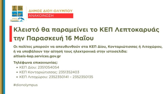 Δήμος Δίου-Ολύμπου: Κλειστό θα παραμείνει το ΚΕΠ Λεπτοκαρυάς την Παρασκευή 16 Μαΐου