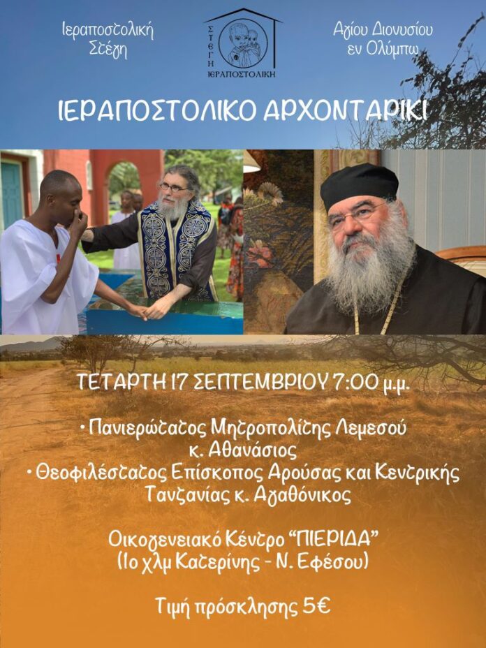 Η Ιεραποστολική Στέγη Αγίου Διονυσίου εν Ολύμπω σας προσκαλεί στο ετήσιο Ιεραποστολικό Αρχονταρίκι που θα πραγματοποιηθεί την Τετάρτη 17 Σεπτεμβρίου και ώρα 7:00 μ.μ. στο Οικογενειακό Κέντρο «Πιερίδα» (1ο χλμ Κατερίνης – Νέας Εφέσου).